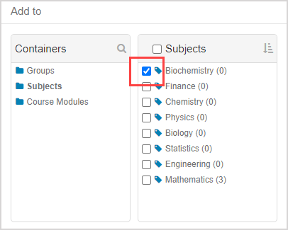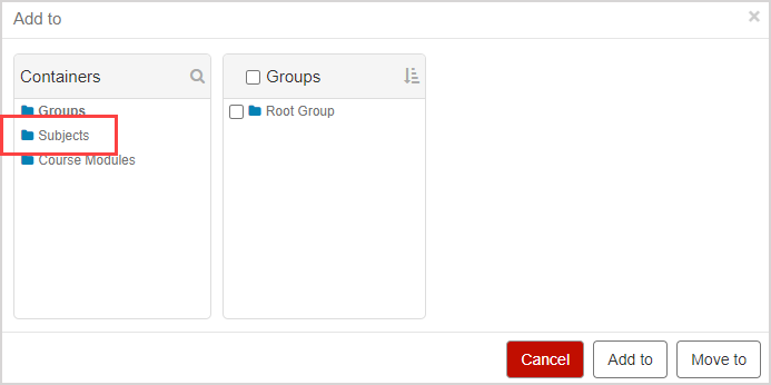Click Subjects from the Containers pane in the Add to window.