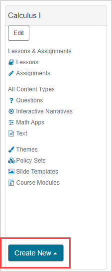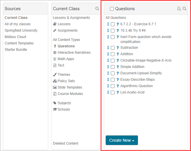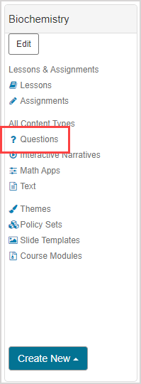 Content — Any component relating to the subject matter of a class (Example — Questions, Text, Lessons, Assignments, Interactive Narratives, Units, etc.).