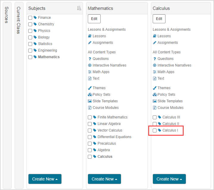 Navigate into a selected subject until you reach the subject that you want to add a child subject to (Example — the Calculus I subject is nested within the Calculus subject, which is nested in the Mathematics subject).