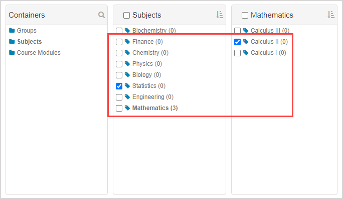 Select the check boxes of all of the content that you want to associate with a subject.