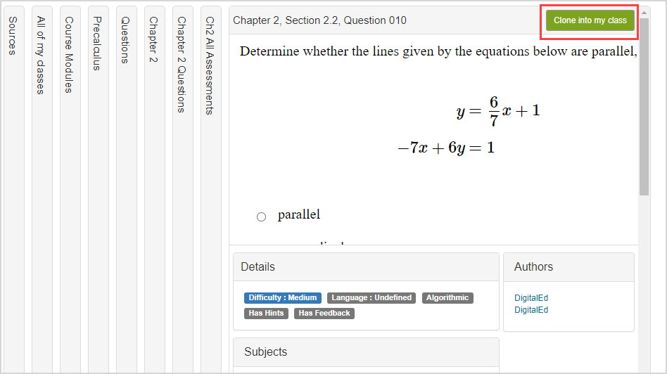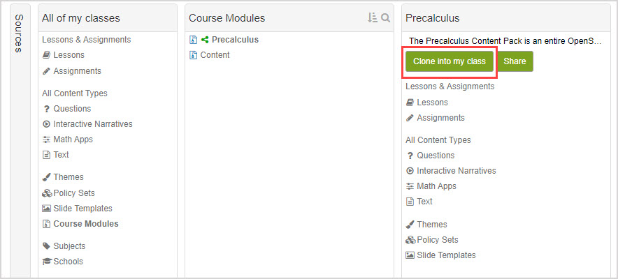 TIP: If you don’t want an entire Content Pack for your class, navigate through the Questions in the course module until you land on the specific piece of content that you want to import, and then click Clone into my class.