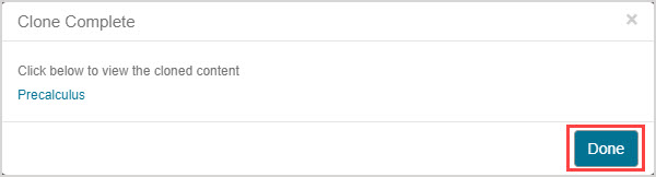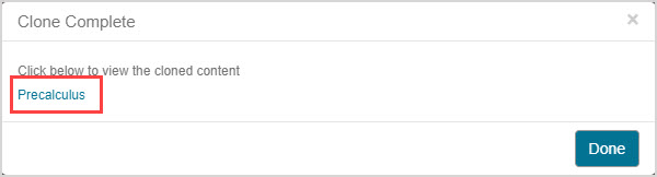 A success message appears when the Content Pack has been cloned into your class. Click the link in the Clone Complete message window to view the imported content in your current class.