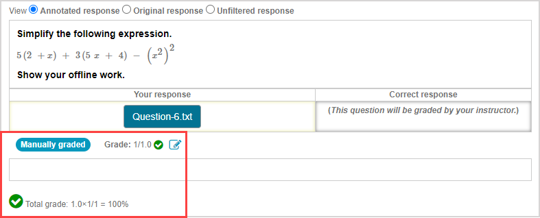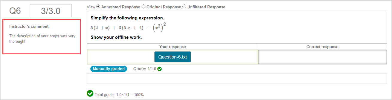 - Annotated response — Displays the response to a question that has been manually graded (only available if the response has been manually graded).
