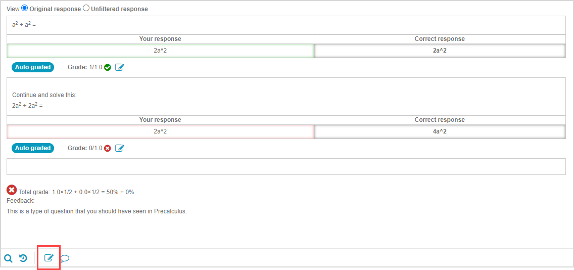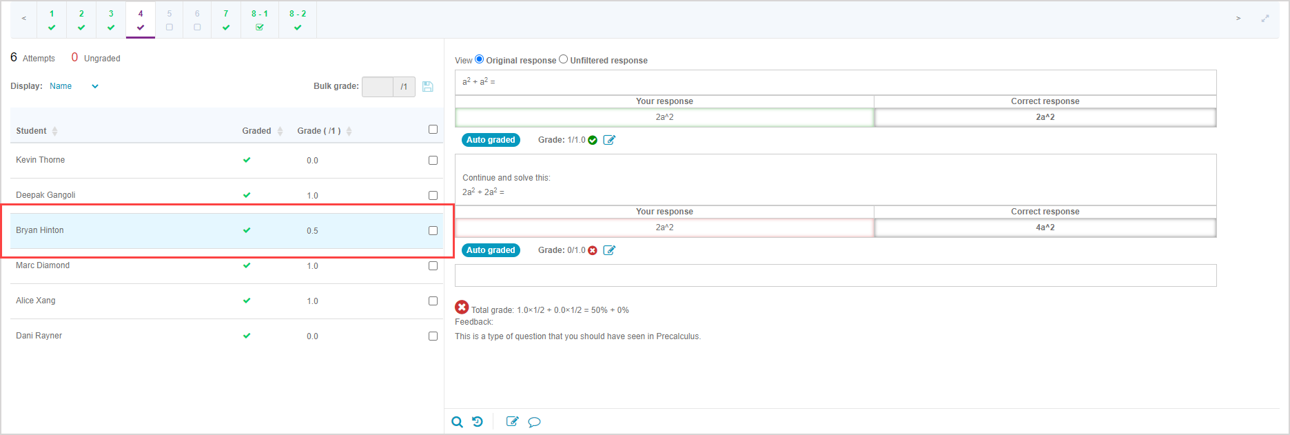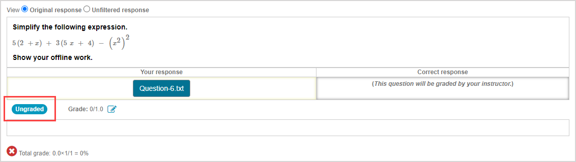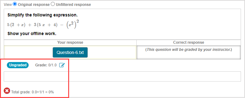 - Original response — Displays the response as the student would have entered it in the response entry field.