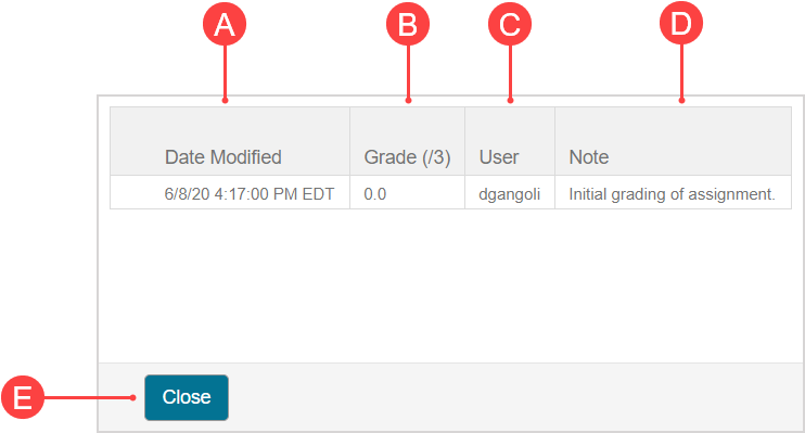 E.Close — Click Close to exit the grade history and return to the Gradebook.