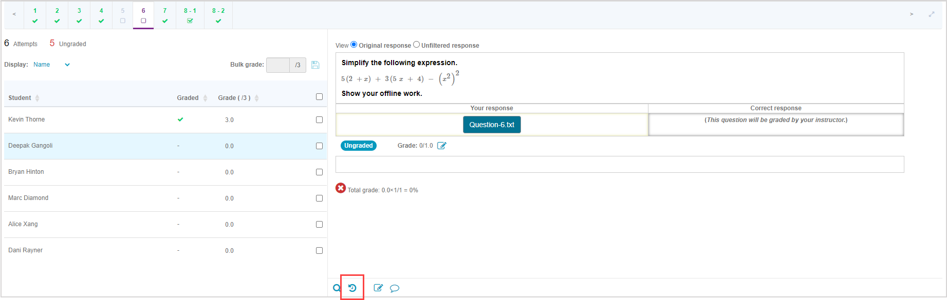 The grade history for a question is a historical log of all overall and part grade changes as well as internal notes.