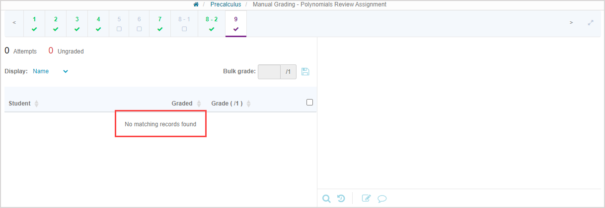 NOTE: If a question wasn't seen by your students (Example — it was added to the activity after your students have already submitted their attempts), no attempt rows will be displayed in the (B) Selection pane and a message appears stating: No matching records found. The question's graded status in the (A) Question pane is auto-graded and considered fully graded.