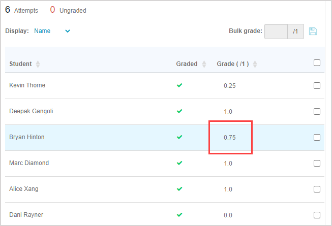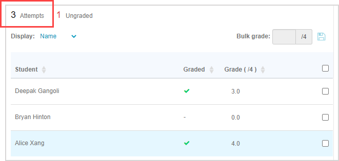 NOTE: The bulk grade field is only available when at least one attempt check box is selected.