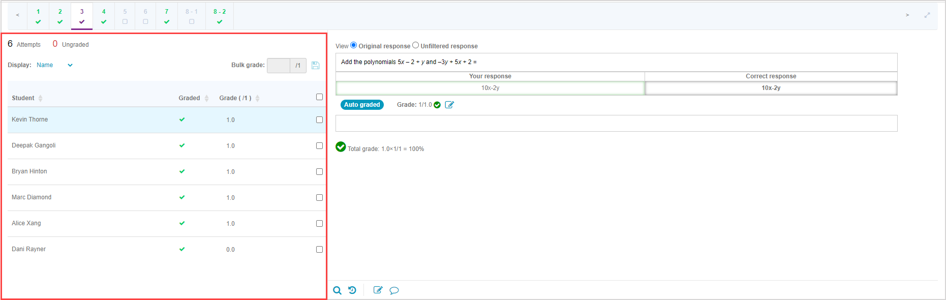 NOTE: Response correctness icons are displayed with each student response and total grade calculation (no correctness icon will be displayed with the total grade calculation if it's overridden by a manual overall grade entry). When a response receives full marks, the correct icon