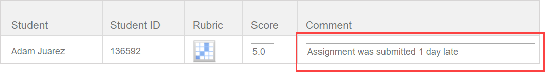The student's grade based on your rubric table selections autofills into the Score field.