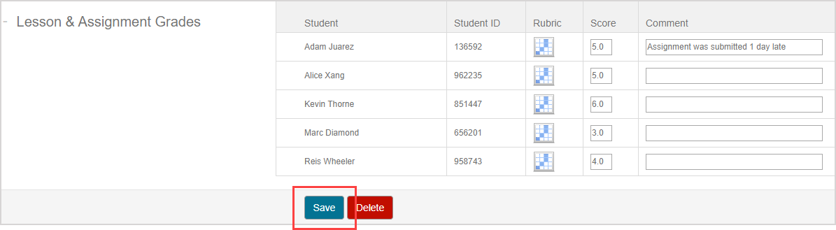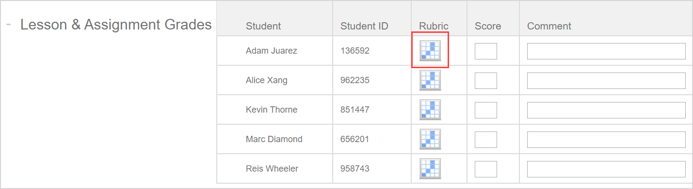 Enter your students' grades by selecting their grade from the applied rubric table.
