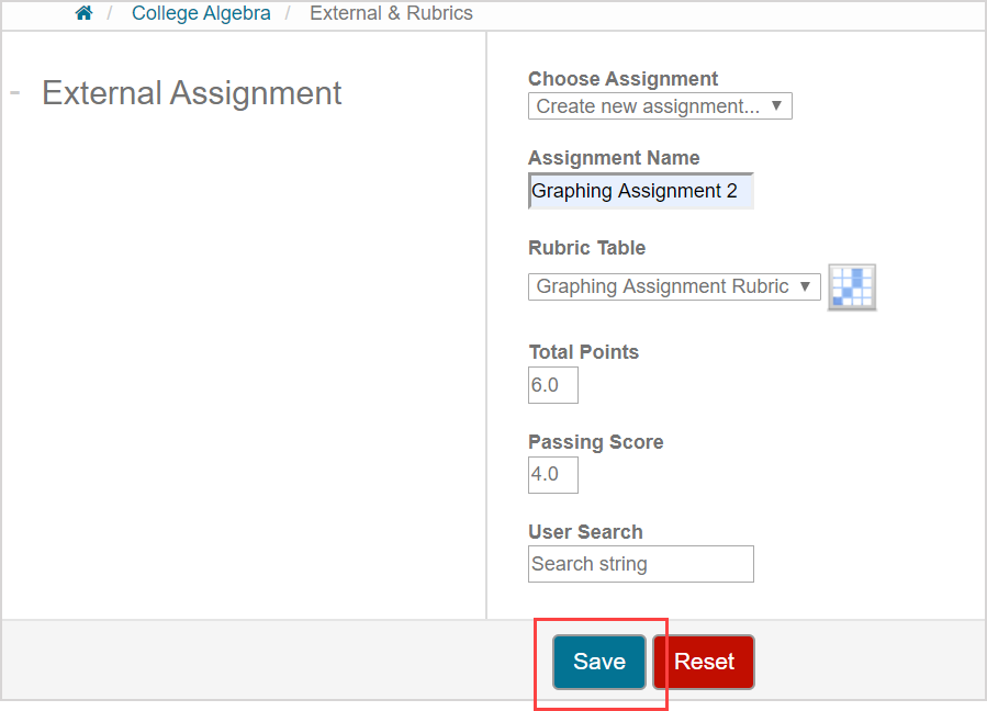 Click Save to save the external activity and to begin entering student grades.