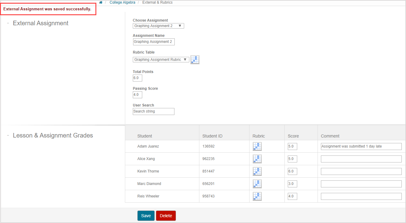 A success message is displayed stating that the external activity was saved successfully. The scores and notes from the rubric tables are pushed to the Gradebook and are visible to your students.