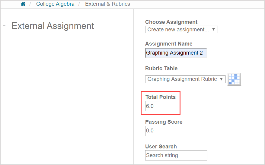 NOTE: The Total Points field of the external activity autofills based on the maximum achievable score defined by the rubric table.
