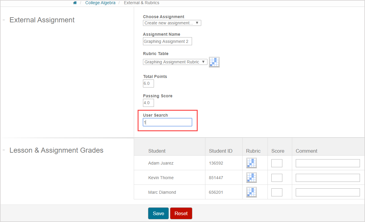 TIP: You can use the User Search field in the External Assignment pane to quickly locate a specific student in the grade list. Start typing either the student name or ID and the results will automatically refine based on your entry.
