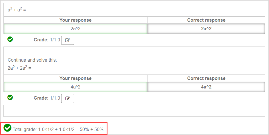The correct icon"Correct" icon is a green check mark.is visible for a total grade when the student gets the entire question correct.
