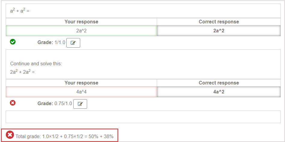 The incorrect/partially correct icon"Incorrect/Partially correct" icon is a red X.is visible for a total grade when the student gets the entire question incorrect or only partially correct.