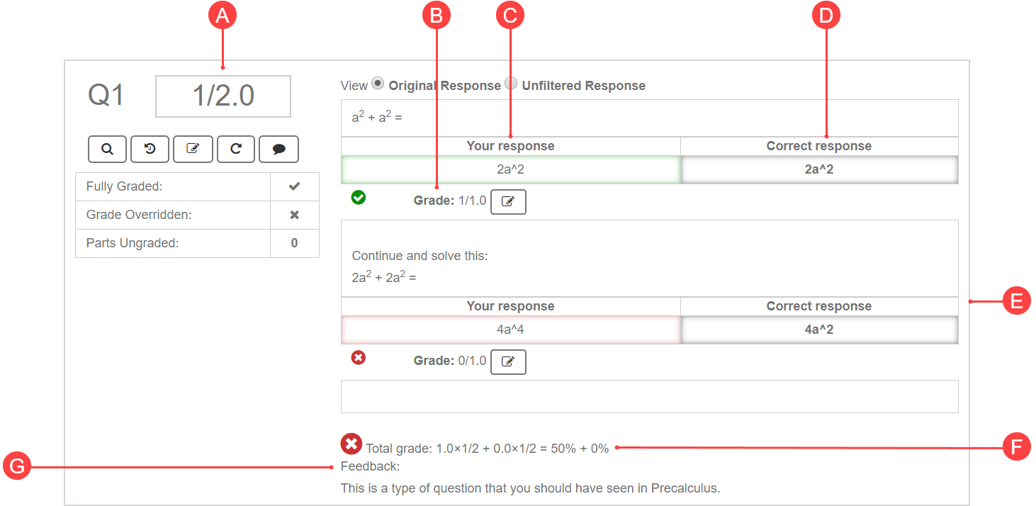 F.Total grade — The overall grade calculation for the entire question that incorporates all of the grades from B and E.