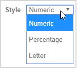 The three options of the grade presentation style drop-down list are shown as numeric, percentage, and letter.
