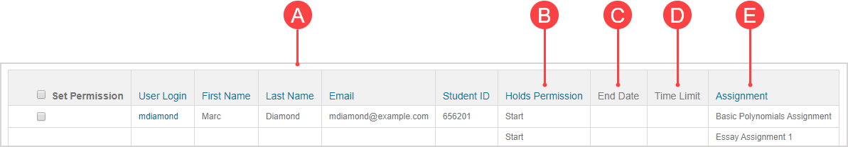 NOTE: An assignment won't be listed for a student in the Permissions Table if the student doesn't hold any permissions for it.