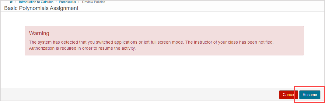 Additionally, if a student exits a proctored exam with the Proctored Browser Mode enabled without first submitting their attempt, they'll require re-authorization to return to their attempt and must click Resume on their warning page.
