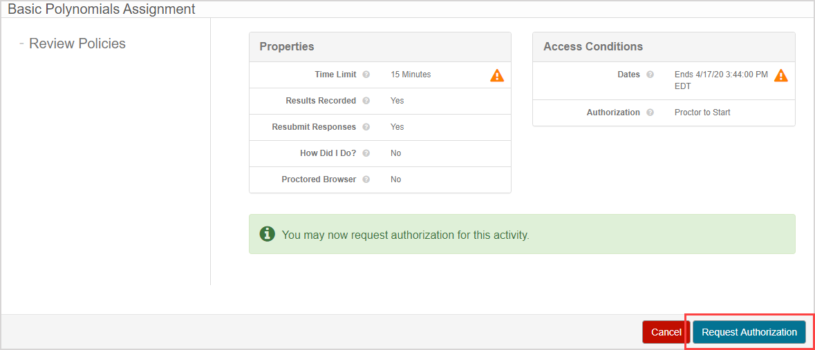 NOTE: The configuration of the assignment properties of a proctored exam determines the need for when authorization of a student's attempt is required. A student will know if they need proctor authorization for their proctored exam from either the launch page or when Submit Assignment is clicked, or both (depending on the assignment's configured properties). If proctor authorization is required to launch or re-enter their attempt, the student must click Request Authorization on the launch page.