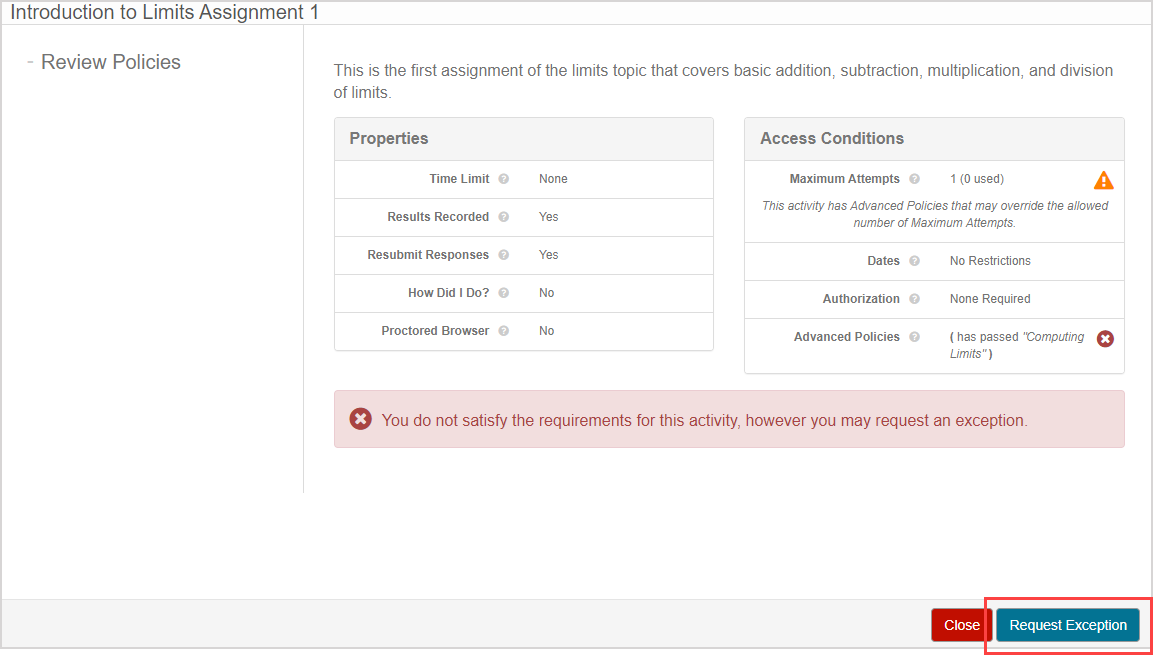 In some scenarios, a student will be able to click Request Exception from the activity's launch page and then notify you or a proctor that an exception has been requested.