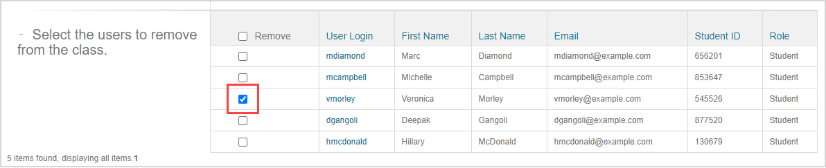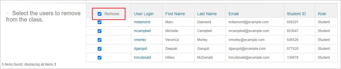 Select the check box(es) of the user(s) in the search results that you want to remove from the class.
