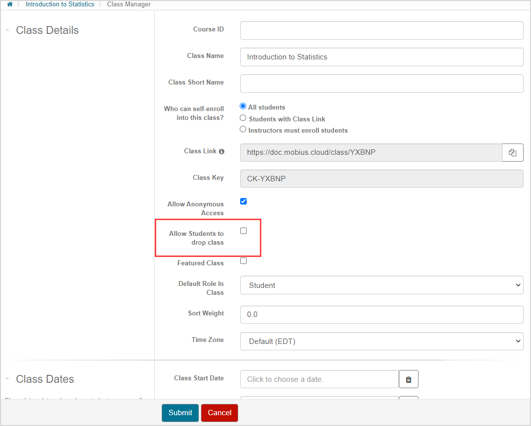 This property leads to a Drop Class button being visible to students on the Class Homepage.
