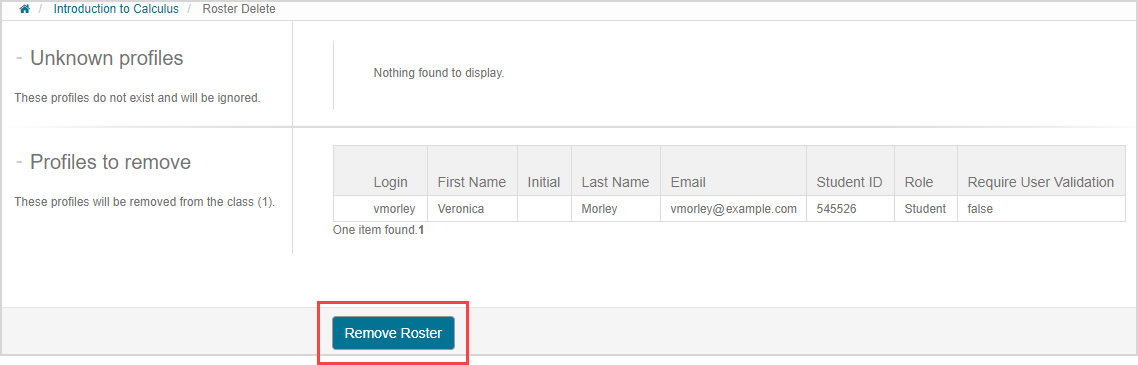 Review the summary of the users that are going to be removed from the class in the Profiles to remove pane. Click Remove Roster if you're satisfied with the summary.