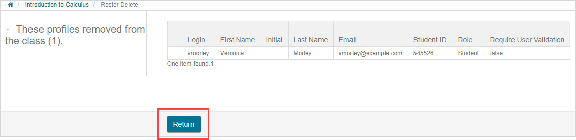 A confirmation summary is displayed of the users that were successfully removed from the class using the user roster file. Click Return to be navigated back to the user search page.