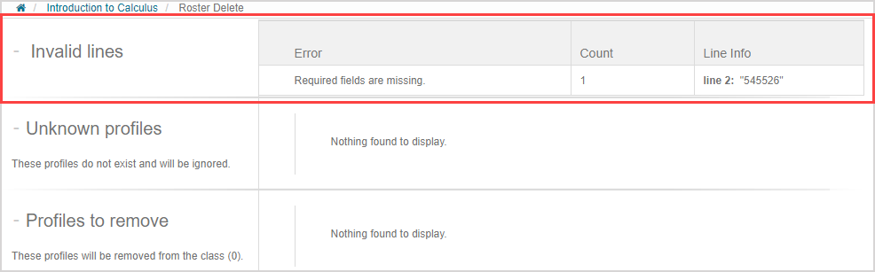 A user will appear listed in the Invalid lines pane if your user roster file doesn't contain the correct attribute headings (Example — the student ID attribute heading is used instead of the login attribute).