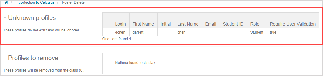NOTE: A user will appear listed in the Unknown profiles pane if Möbius doesn't recognize the user as being enrolled in your class (Example — perhaps there's a typo in the user login that you've entered).