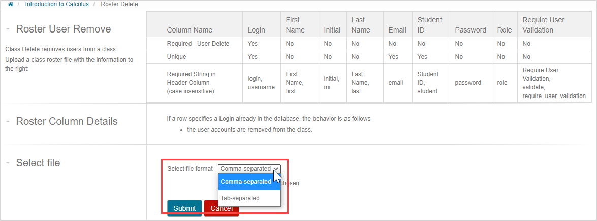 To upload a user roster file to remove—or unenroll—a user from a class: