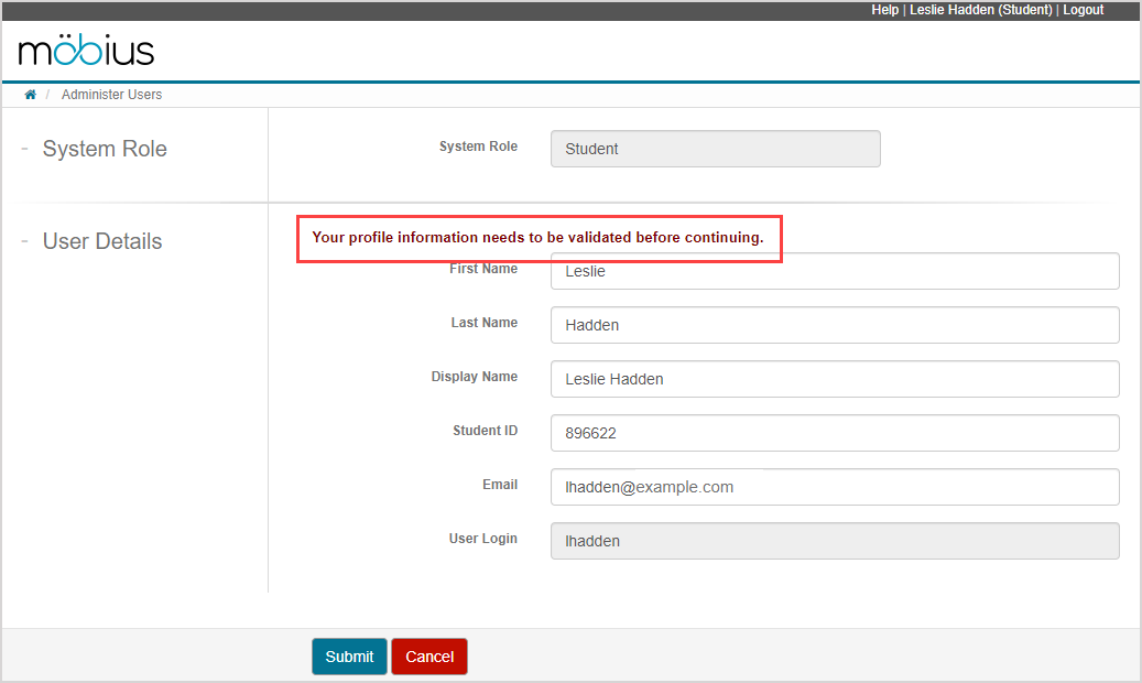 If this option was selected upon creating your account, you'll be required to validate your profile the next time you log in to Möbius.