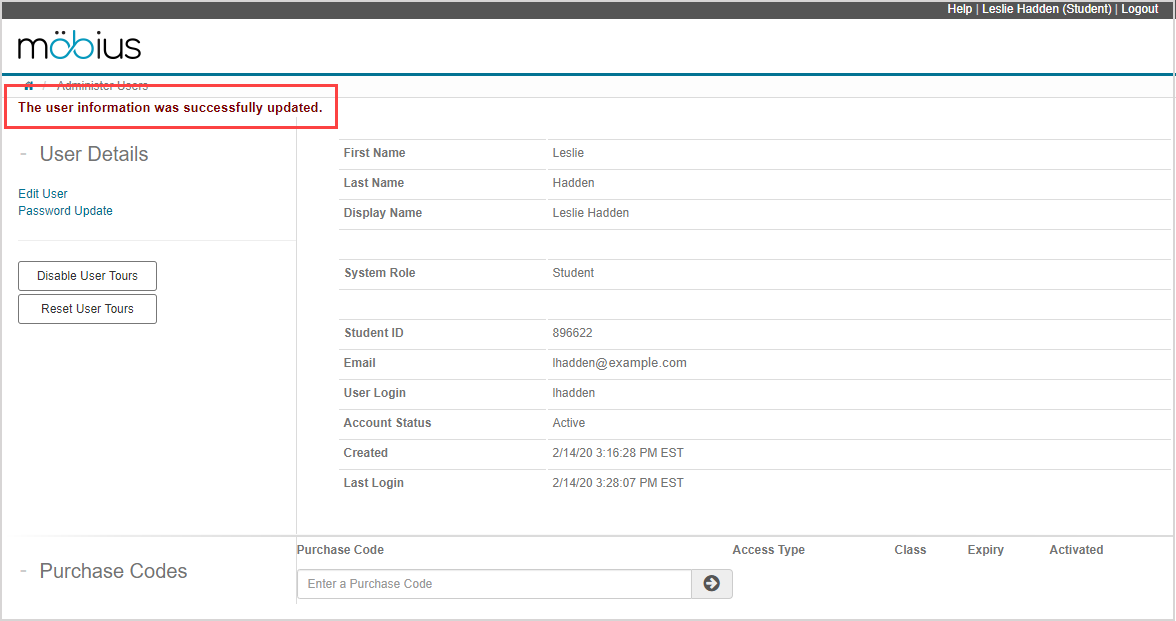 1.  A success message is displayed that your profile has been successfully updated. You can now continue using Möbius.