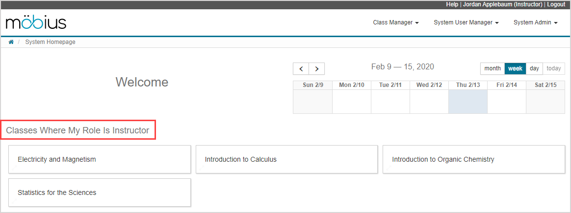 The System Homepage has the "Class Where My Role Is Instructor" heading.