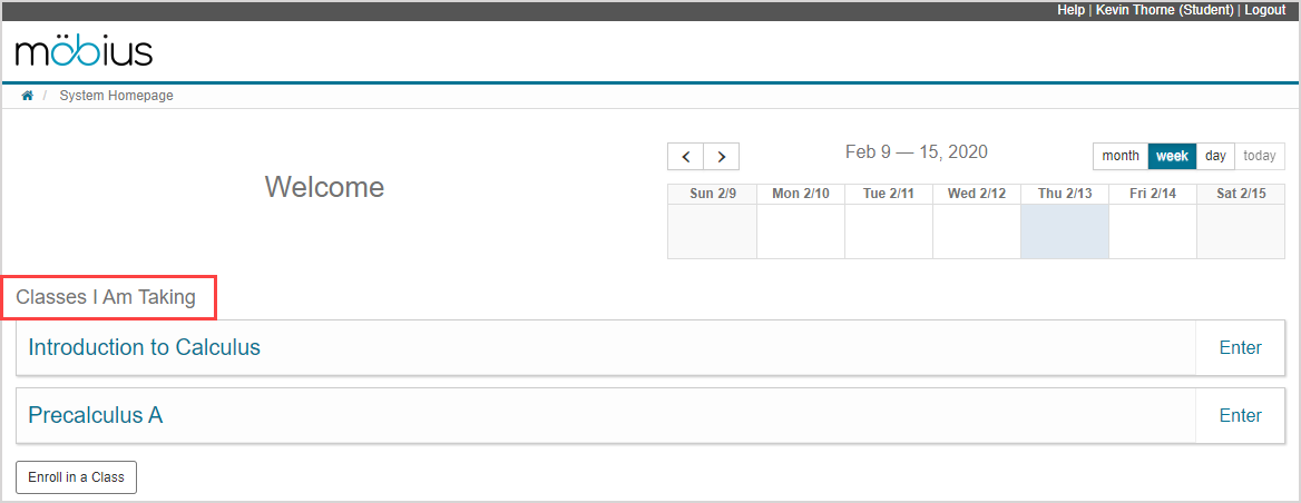 The classes that you're enrolled in are displayed in the Class List pane on the System Homepage.