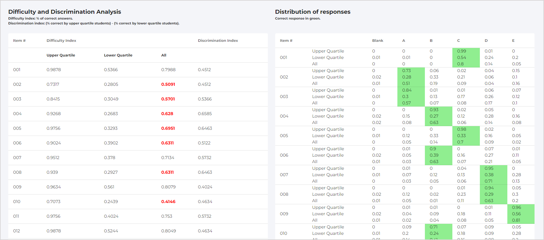 The data in the Difficulty and Discrimination Analysis table and the Distribution of responses table is explained below: