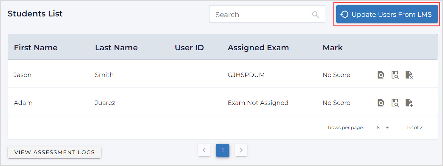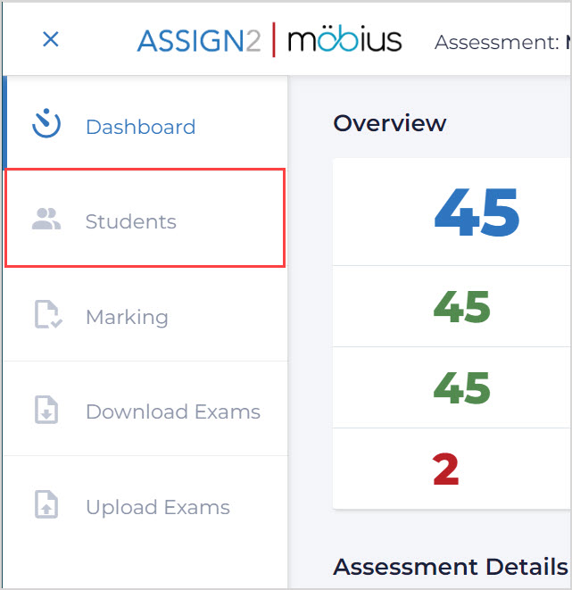 Once an assessment has been created in Möbius Grading, you can use the Students page to view the list of students who will complete the assessment, as well as perform tasks related to managing the students submissions for the assessment.