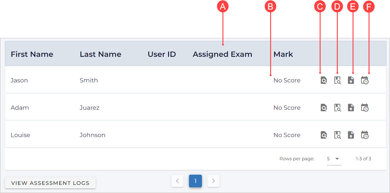 D. View activity logs — Clickable button to view information about student or grading activity for the assessment.