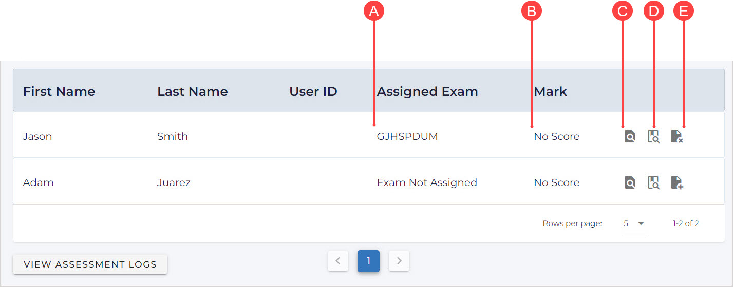 E. Assign/Unassign Exam — Clickable button to assign a scanned exam to the student, or to unassign the current assigned exam for the student.