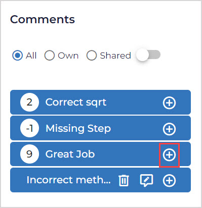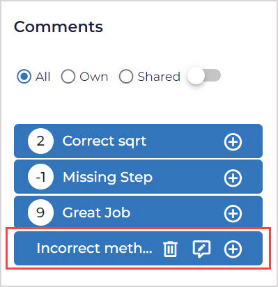 Enable the Save and Share checkboxes to save your comment for future use in this question, and share it with other users grading this question.