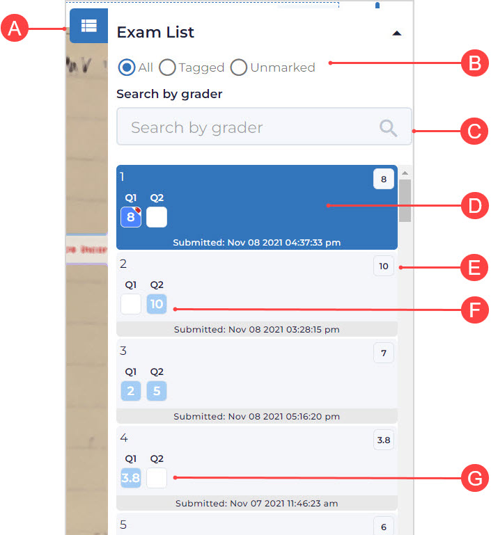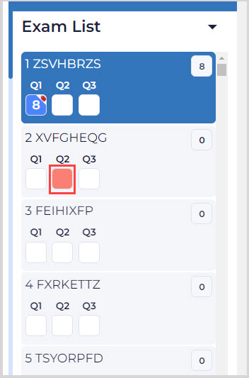 TIP: To support collaborative grading, a student's submission in the Exam List that is currently being viewed by another grader is highlighted in red.