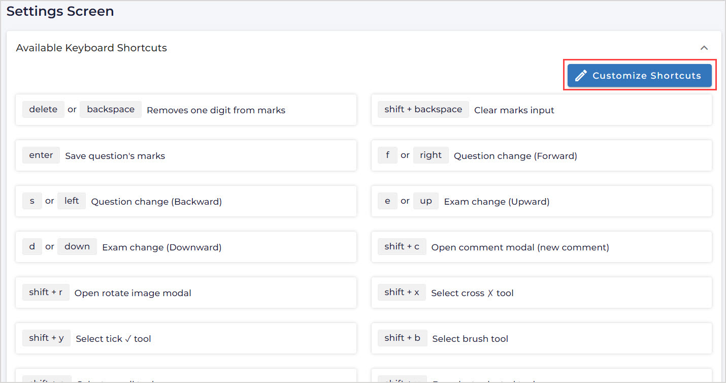 Each grader can use individualized keyboard shortcuts to assist with the grading process.
