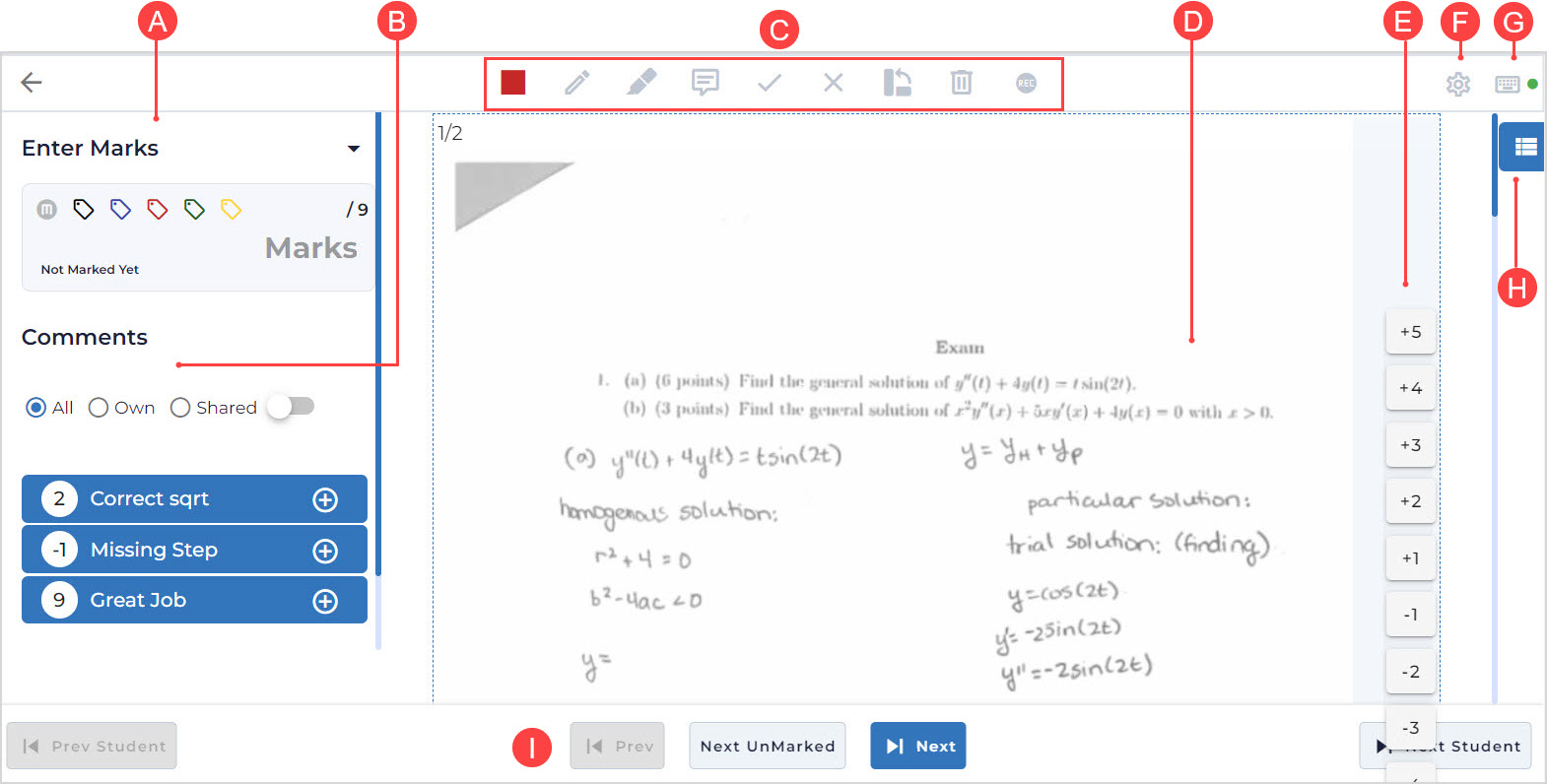 I. Navigation buttons — Navigate to the Previous Student or Next Student and their full submission, or navigate to the Previous, Next Unmarked, or Next submission by the current student.