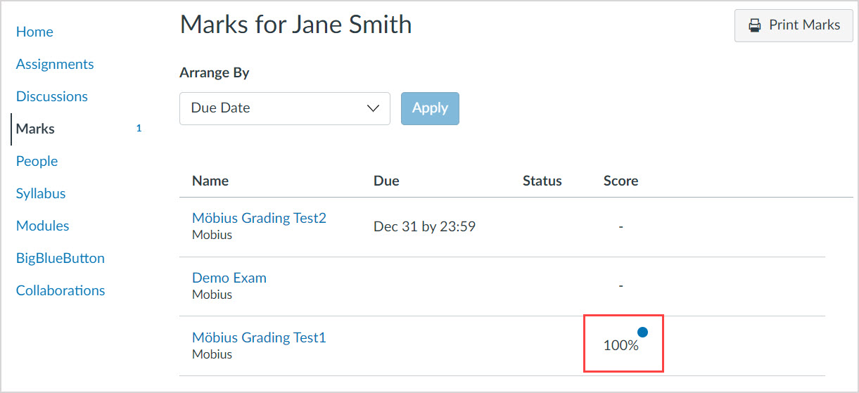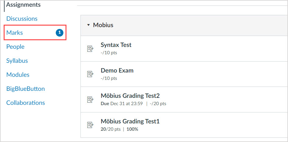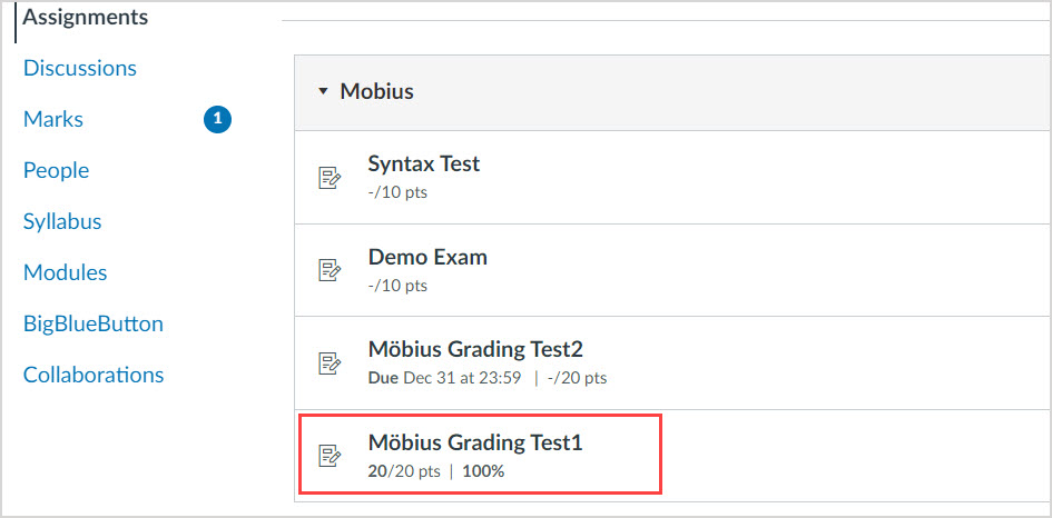 Since Möbius Grading is integrated with your school's Learning Management System (LMS) (Example — Blackboard®, Brightspace®, Canvas™, Moodle™, etc.) as an external tool, your grades from Möbius Grading assessments will appear alongside other grades from your course.