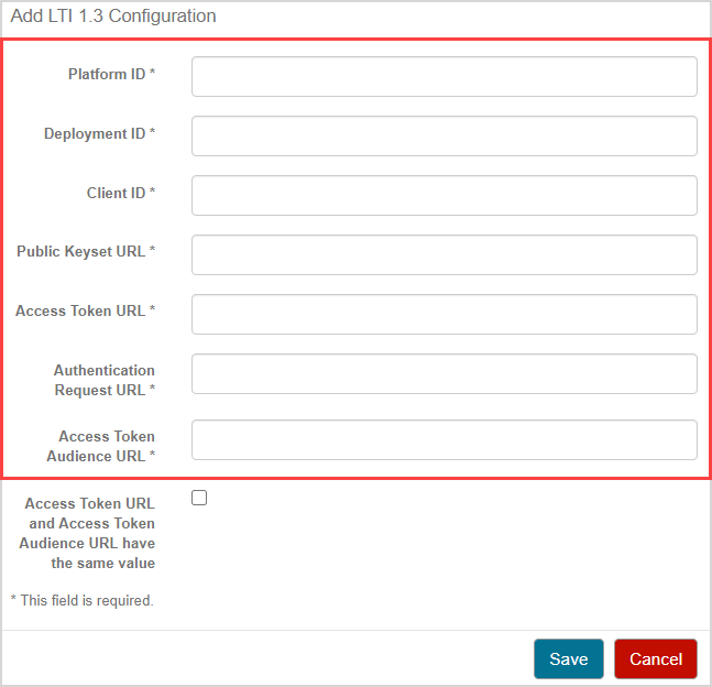 NOTE: If you haven't been provided an Access Token Audience URL by your Learning Management System, that means that this parameter has the same value as the Access Token URL field. Click the Access Token URL and Access Token Audience URL have the same value check box to automatically copy the Access Token URL into the Access Token Audience URL field.