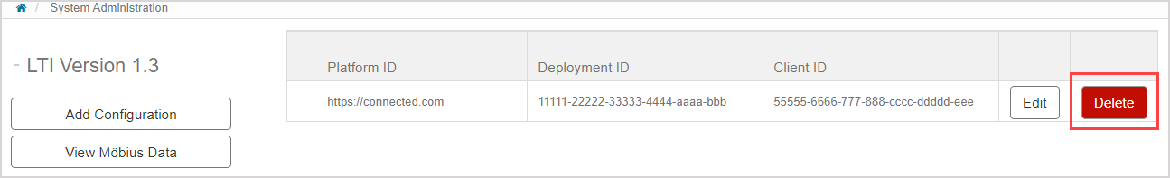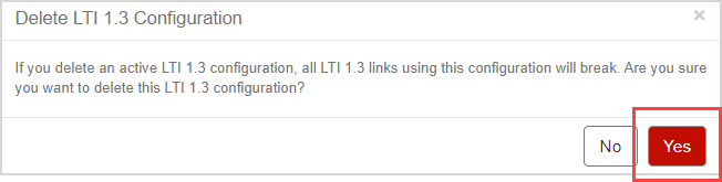 IMPORTANT: Only delete an LTI configuration if you know that it's no longer in use. Click Delete in the configuration row to delete the setup.