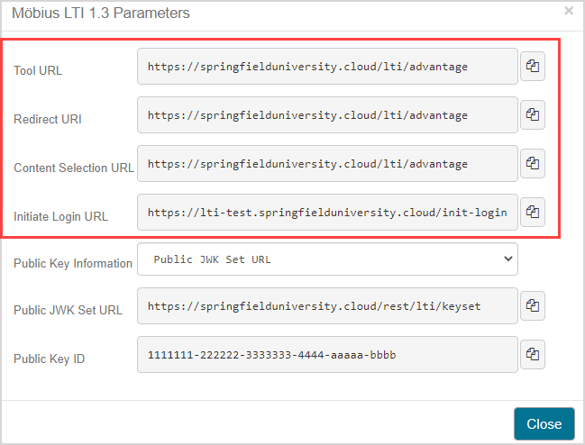 After configuration of the LTI tool in your Learning Management System, you need to provide Möbius with the data from your Learning Management System to complete configuration of the LTI 1.3 connection.